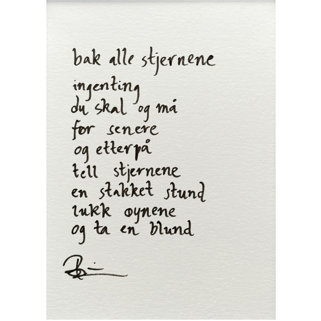Håndskrevet og signert dikt på passepartout-papir. Passer fint til å henge ved siden av motivet det er skrevet til, eller settes på et bord eller en kommode.