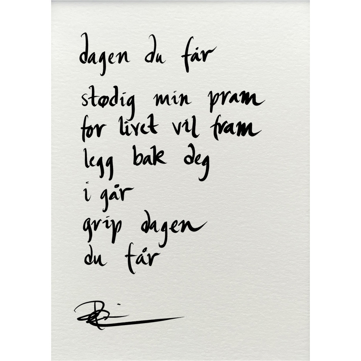 Håndskrevet og signert dikt på passepartout-papir. Passer fint til å henge ved siden av motivet det er skrevet til, eller settes på et bord eller en kommode.