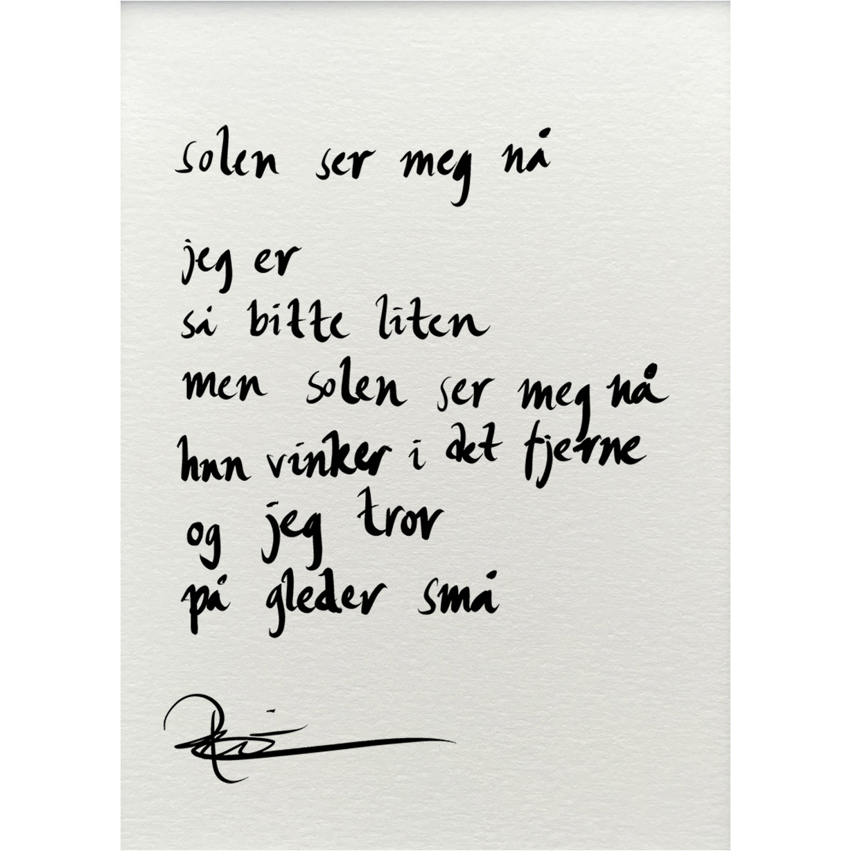 Håndskrevet og signert dikt på passepartout-papir. Passer fint til å henge ved siden av motivet det er skrevet til, eller settes på et bord eller en kommode.