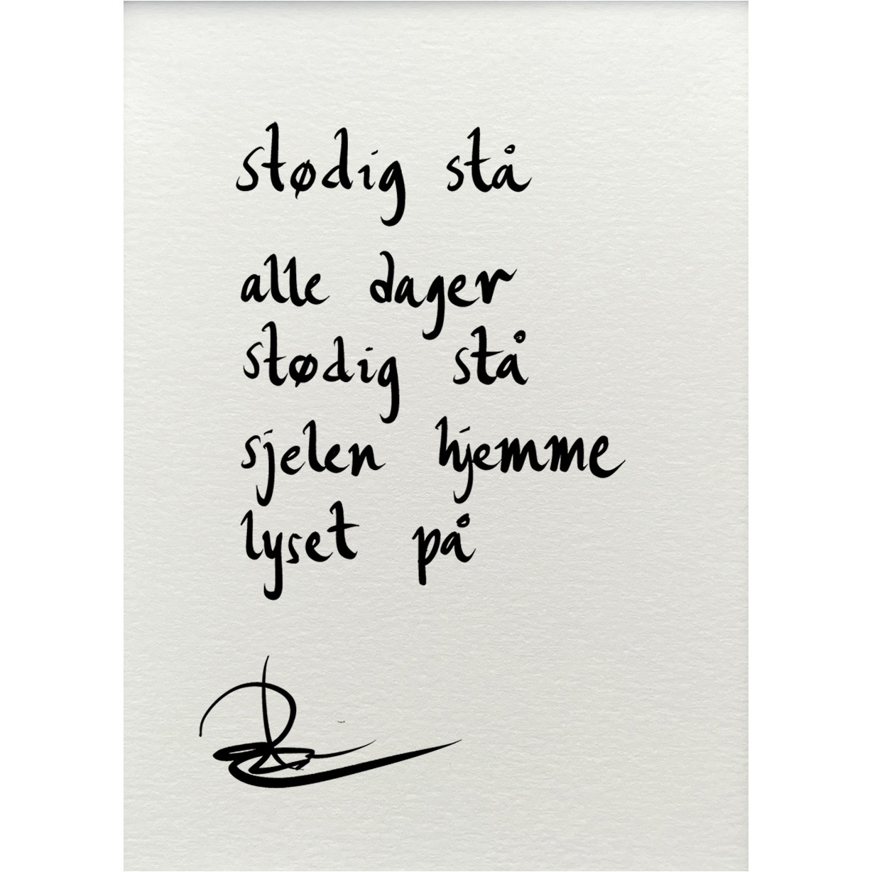 Håndskrevet og signert dikt på passepartout-papir. Passer fint til å henge ved siden av motivet det er skrevet til, eller settes på et bord eller en kommode.