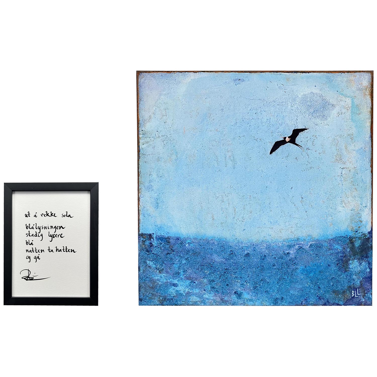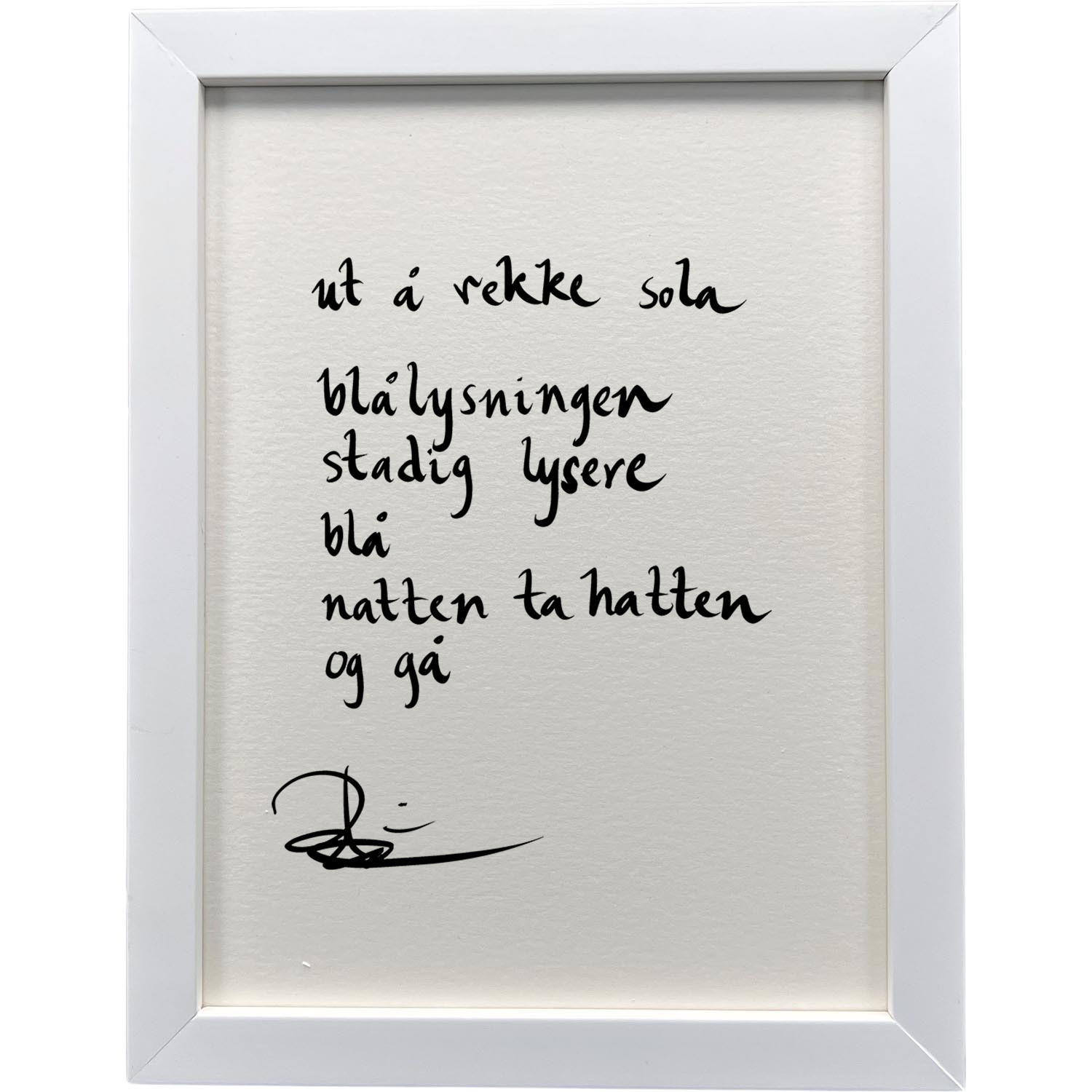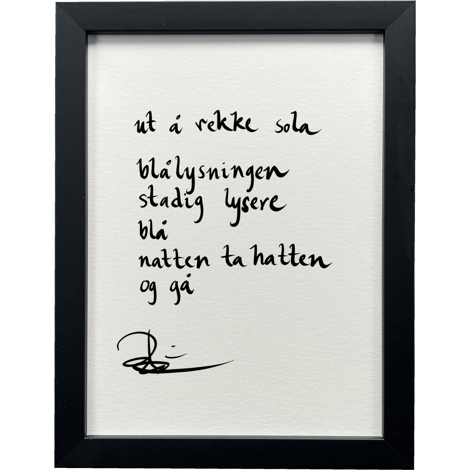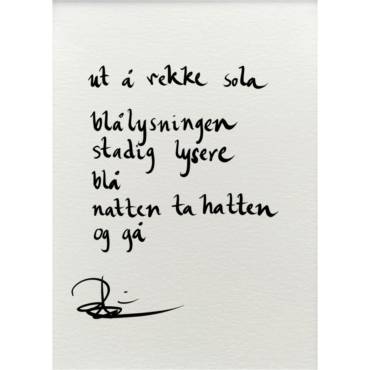 Håndskrevet og signert dikt på passepartout-papir. Passer fint til å henge ved siden av motivet det er skrevet til, eller settes på et bord eller en kommode.