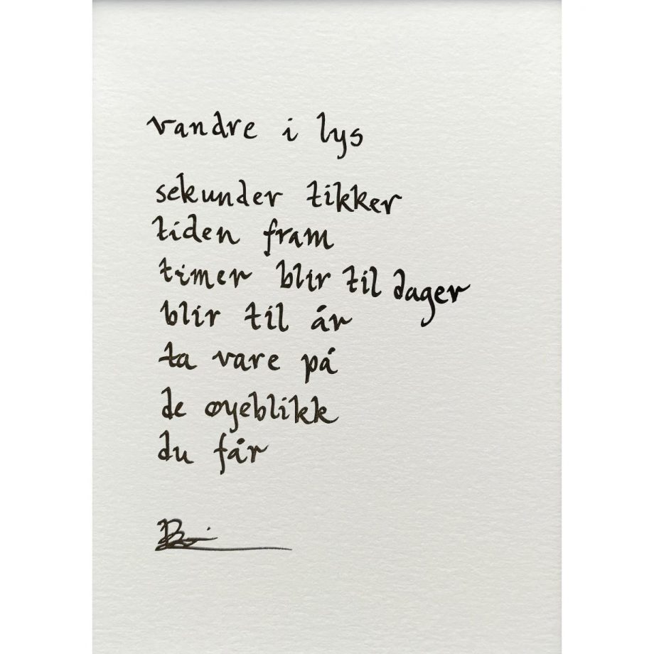 Håndskrevet og signert dikt på passepartout-papir. Passer fint til å henge ved siden av motivet det er skrevet til, eller settes på et bord eller en kommode.