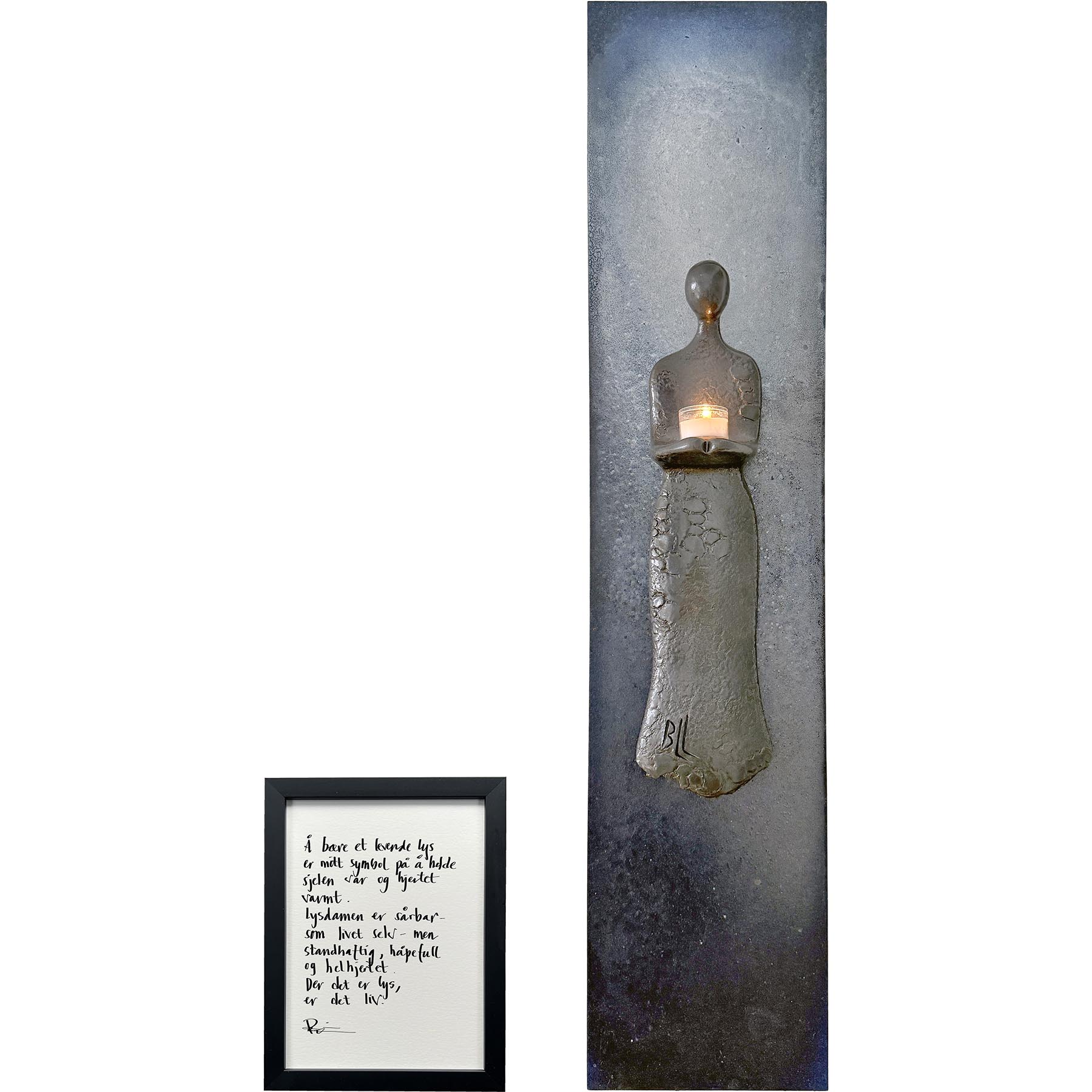Keramisk lysdame/relieff montert på plate av behandlet metall. Originalt kunstverk som finnes bare i èn utgave. Selve skulpturen er i keramikk. Leveres ferdig med oppheng bak.