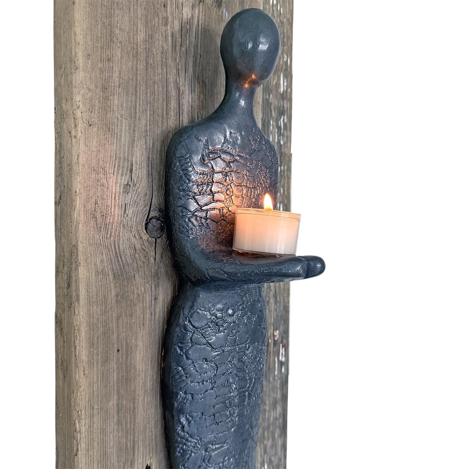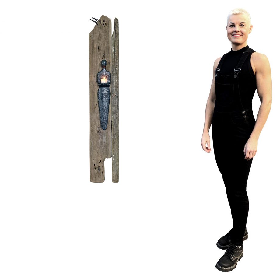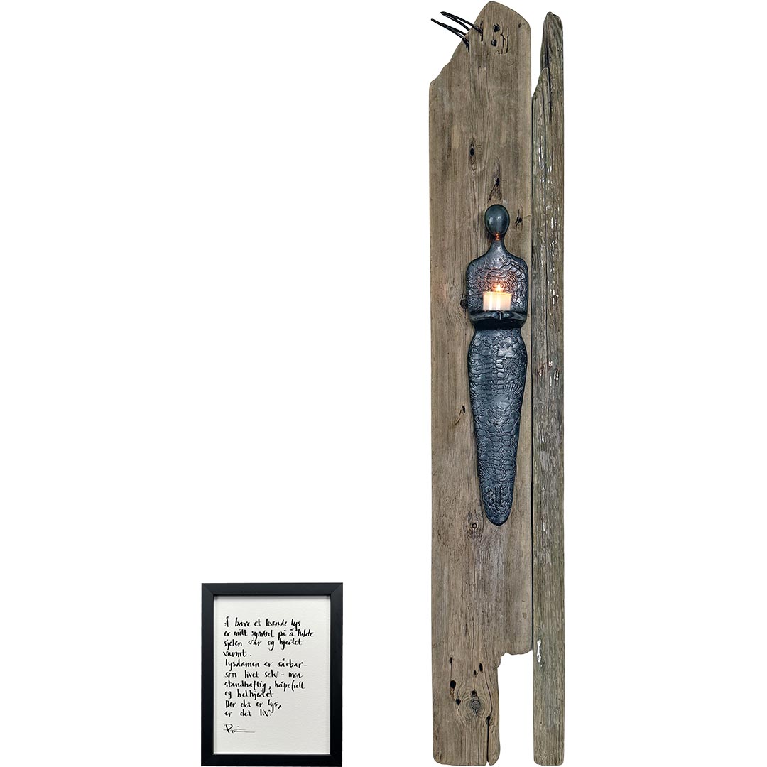 Keramisk lysdame/relieff montert på kraftig og behandlet rekved. Rekveden er sanket i fjæra. Originalt kunstverk – finnes bare i èn utgave. Selve skulpturen er i keramikk. Leveres ferdig med oppheng.